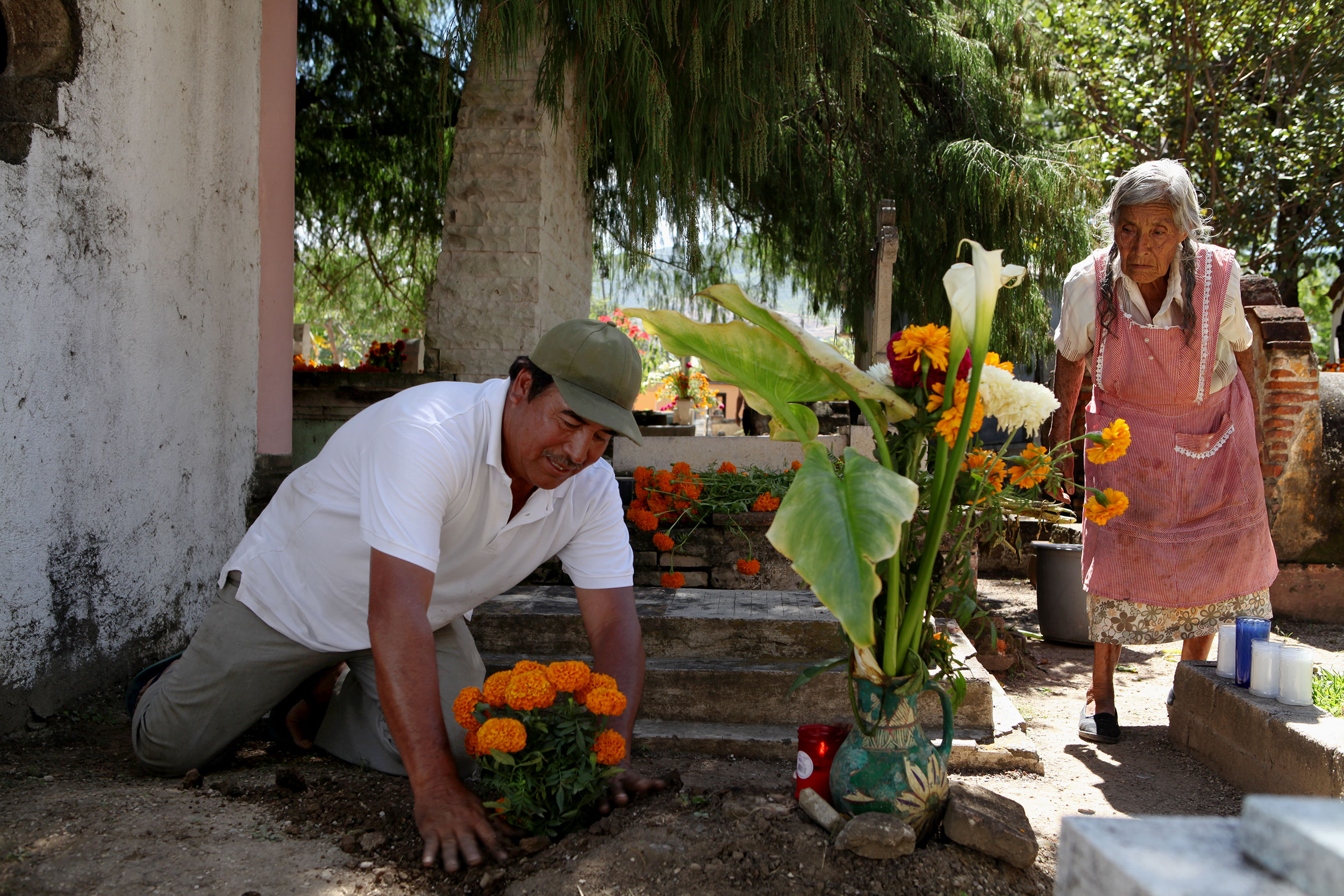 Martin Santiago Lopez plants marigolds for day of the dead on the tomb of his grandfather as his mother watches in the cemetery of Santa Maria del Tule, Mexico. Most of their family buried in the cemetery and since the family trade is landscaping they use a lot of plants in their Dia De Los Muertos decorations.Photo: Alex Washburn