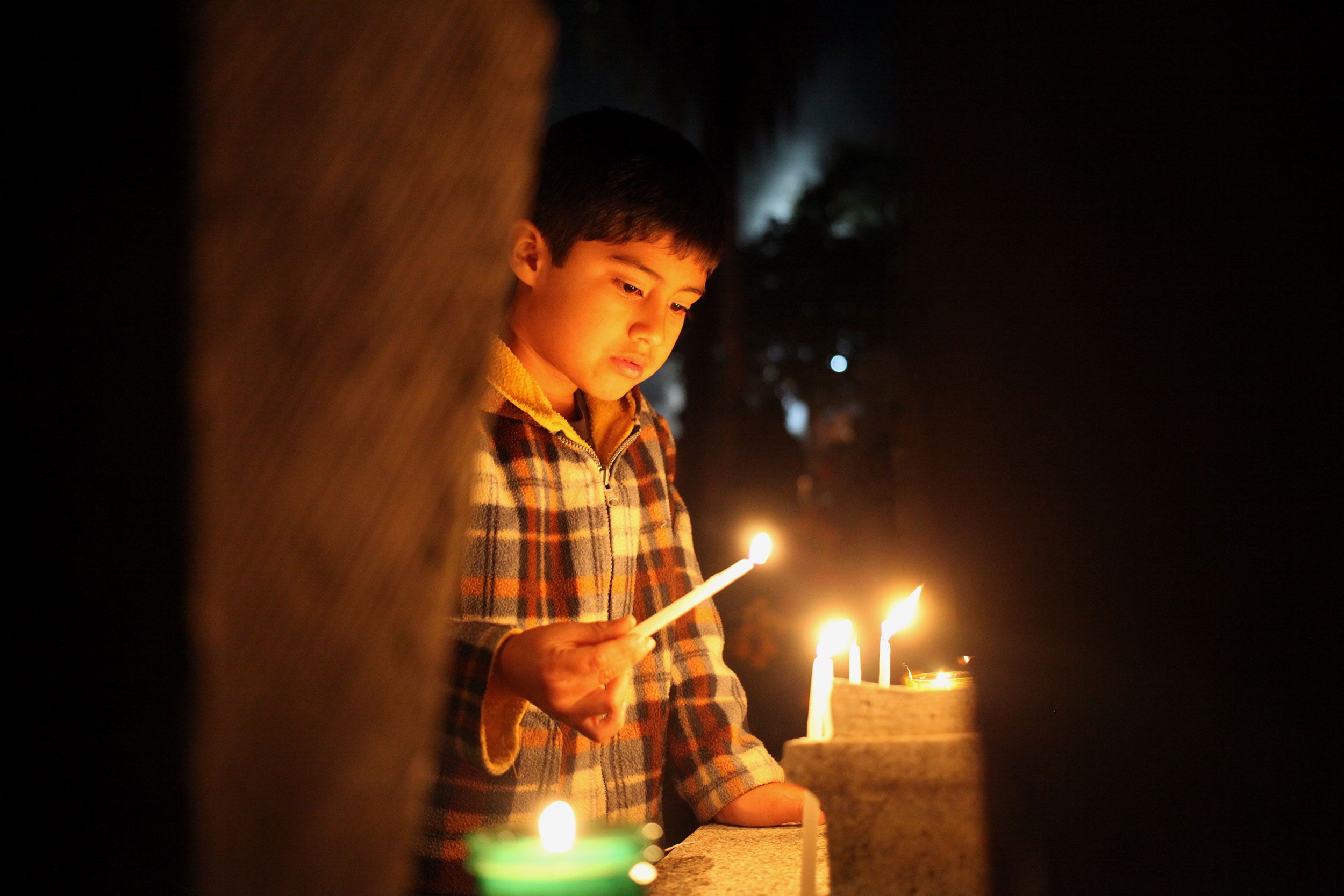 A young boy lights candles with his sister and grandfather in the main cemetery of Xoxocotlan Mexico in observance of Dia De Los Muertos. Photo: Alex Washburn