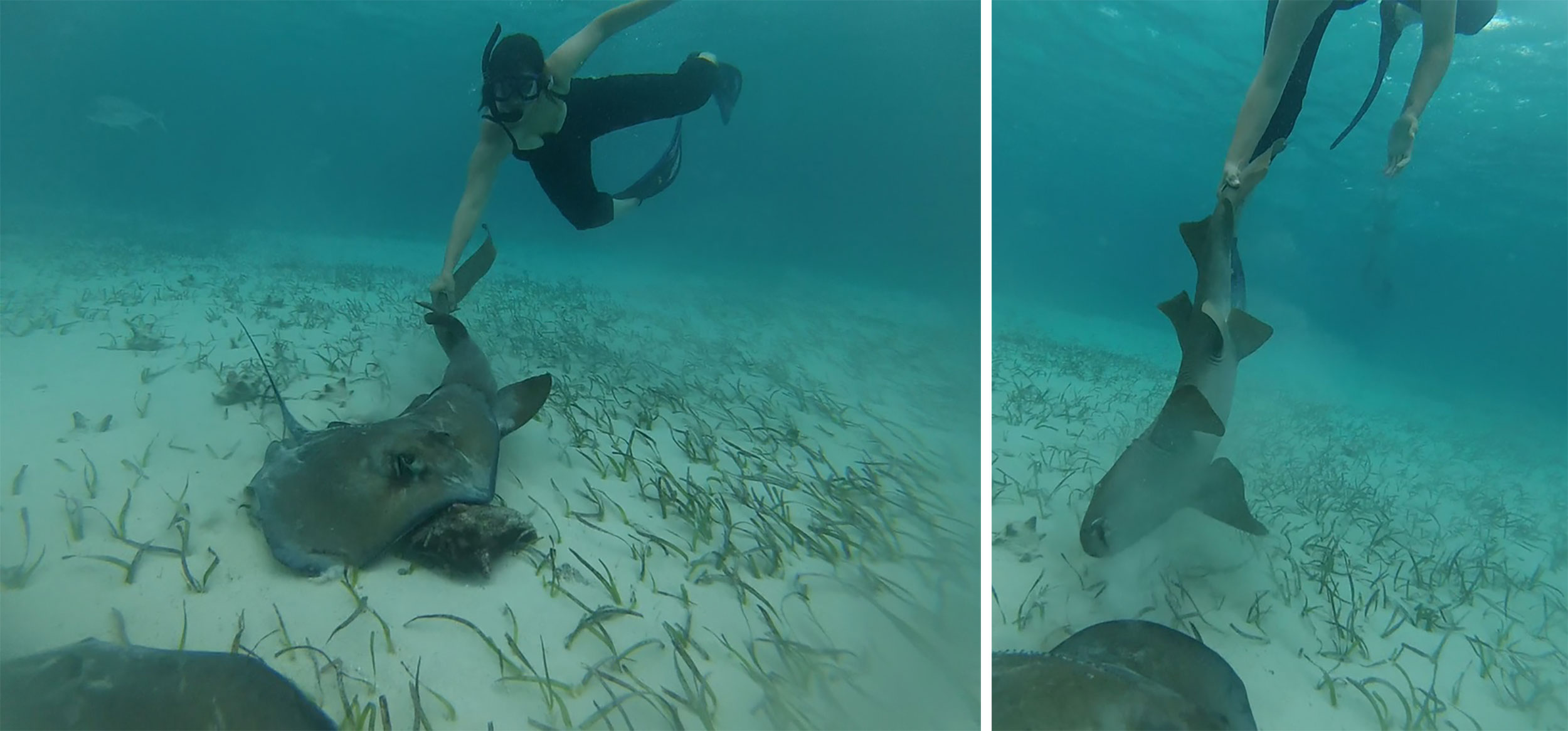 I picked out a smaller nurse shark perhaps 3-4 feet long and swam down to it. When I got close I reached out to grab it’s tail and very gently twisted. The shark rolled over in the water like a puppy looking for a belly rub and allowed me to bring it almost to the surface. I let it go and it swam away and went back to eating.