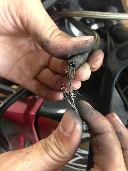 Alex shows off the damage after pulling the frayed clutch cable out of her bike. Photo: Alex Washburn