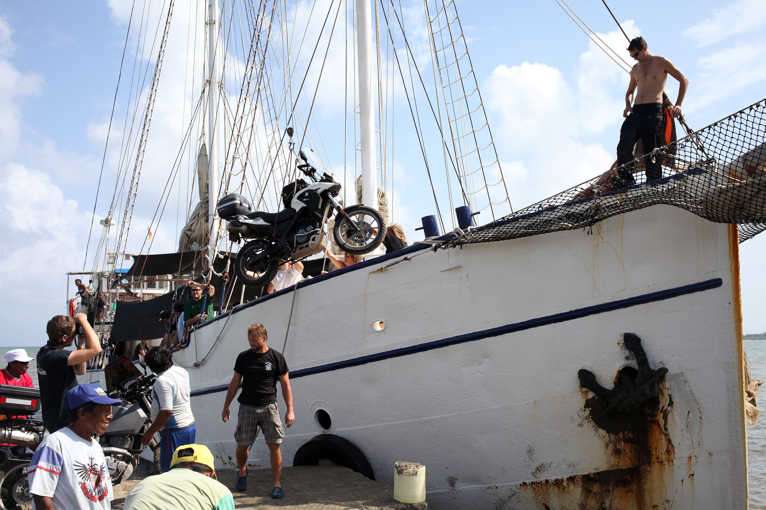 Captain Ludwig (wearing pants for the only time during our three day trip) told us to take the Panniers off our bikes as an army of locals began tying ropes to our motorcycles so that they could be hoisted onto the ship. The Stahlratte approached and we all held our breaths as each bike was lifted into the air and over the edge of the boat. It is a scary sight to watch a 1200GS BMW lifted over salt water by a few ropes even if it isn’t yours.