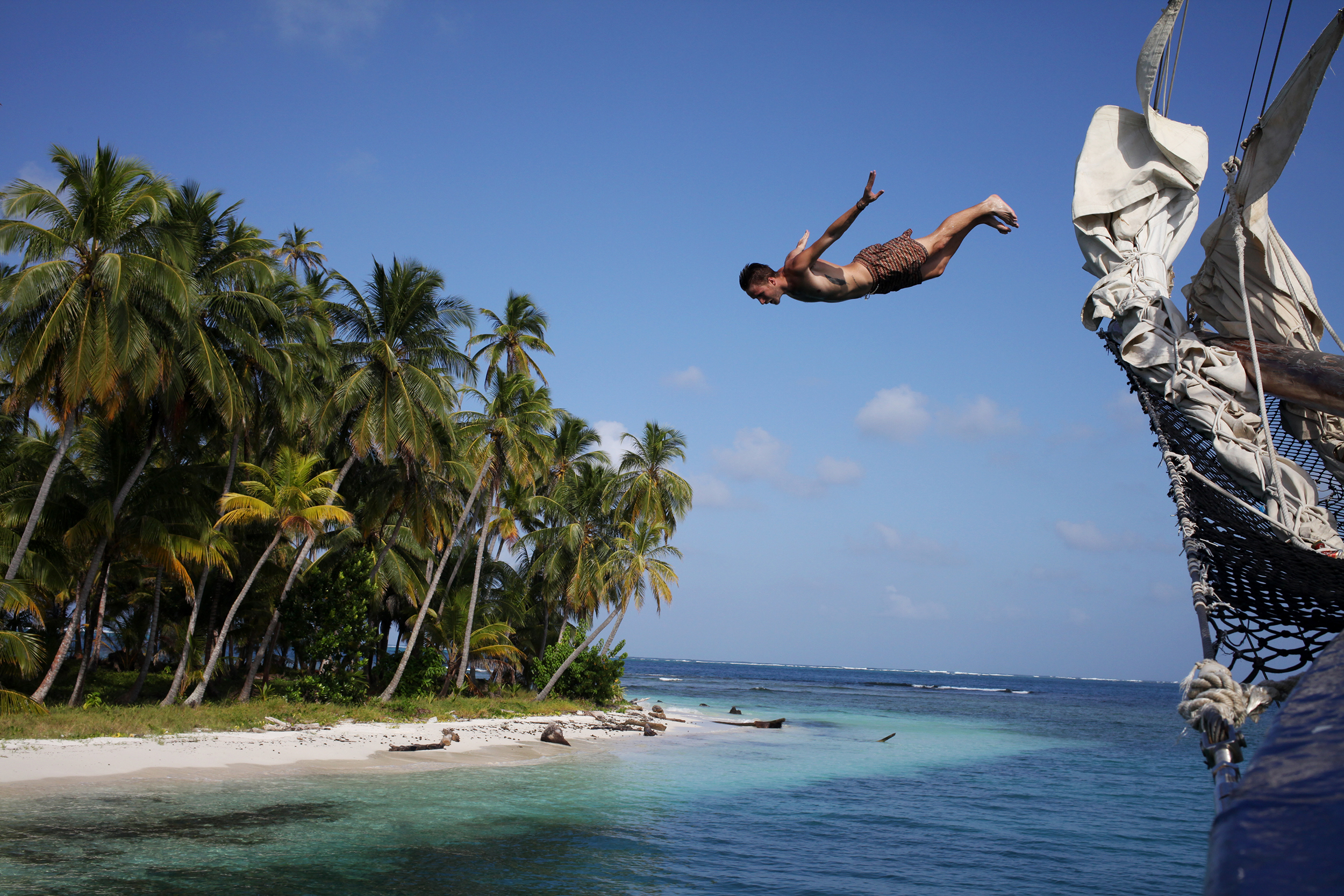 Jesse and Nico laugh at the bow of the ship as we motor out to the San Blas Islands. Photo: Alex Washburn