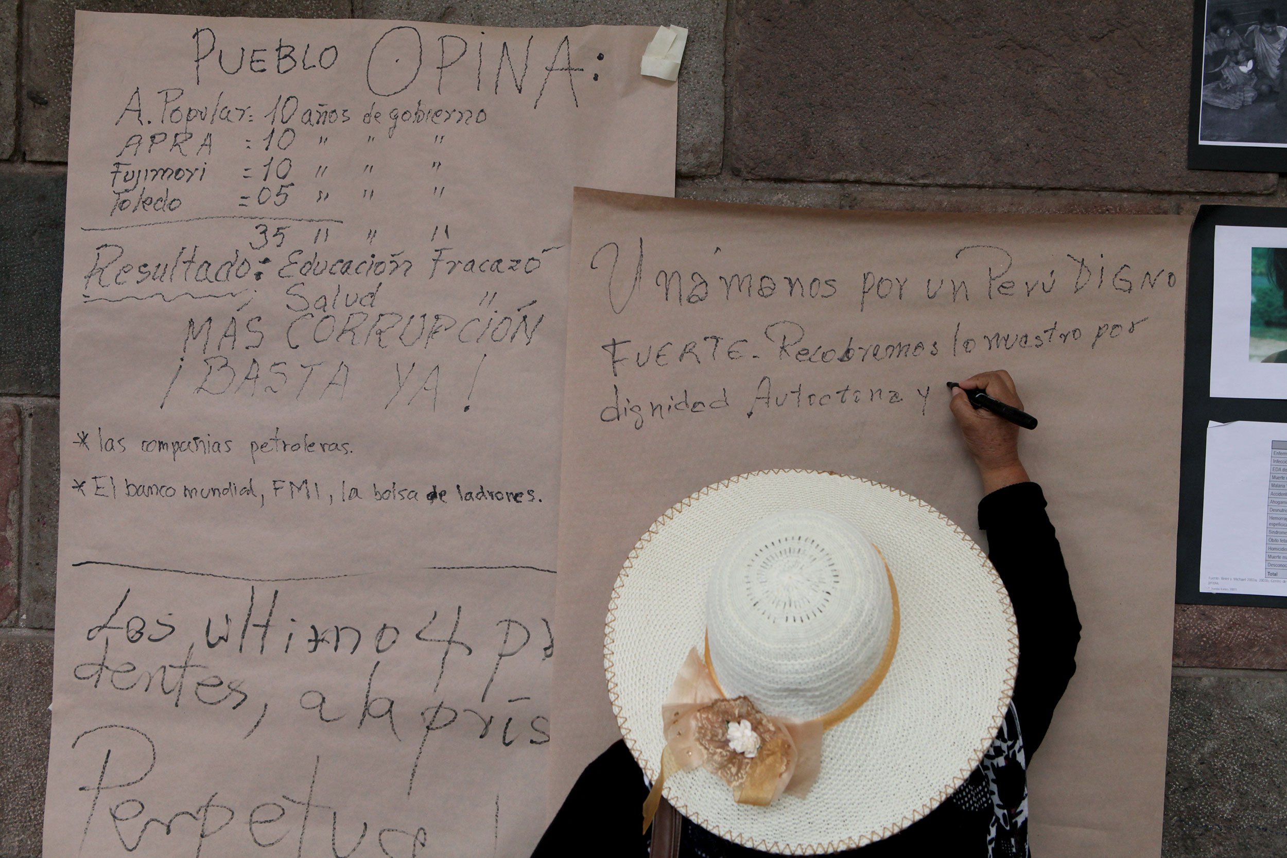 A woman ads her own opinions to a growing list of complaints during a protest against the Peruvian government in Plaza De Armas of Cusco Peru on Tuesday, Feb. 25, 2014. Photo: Alex Washburn
