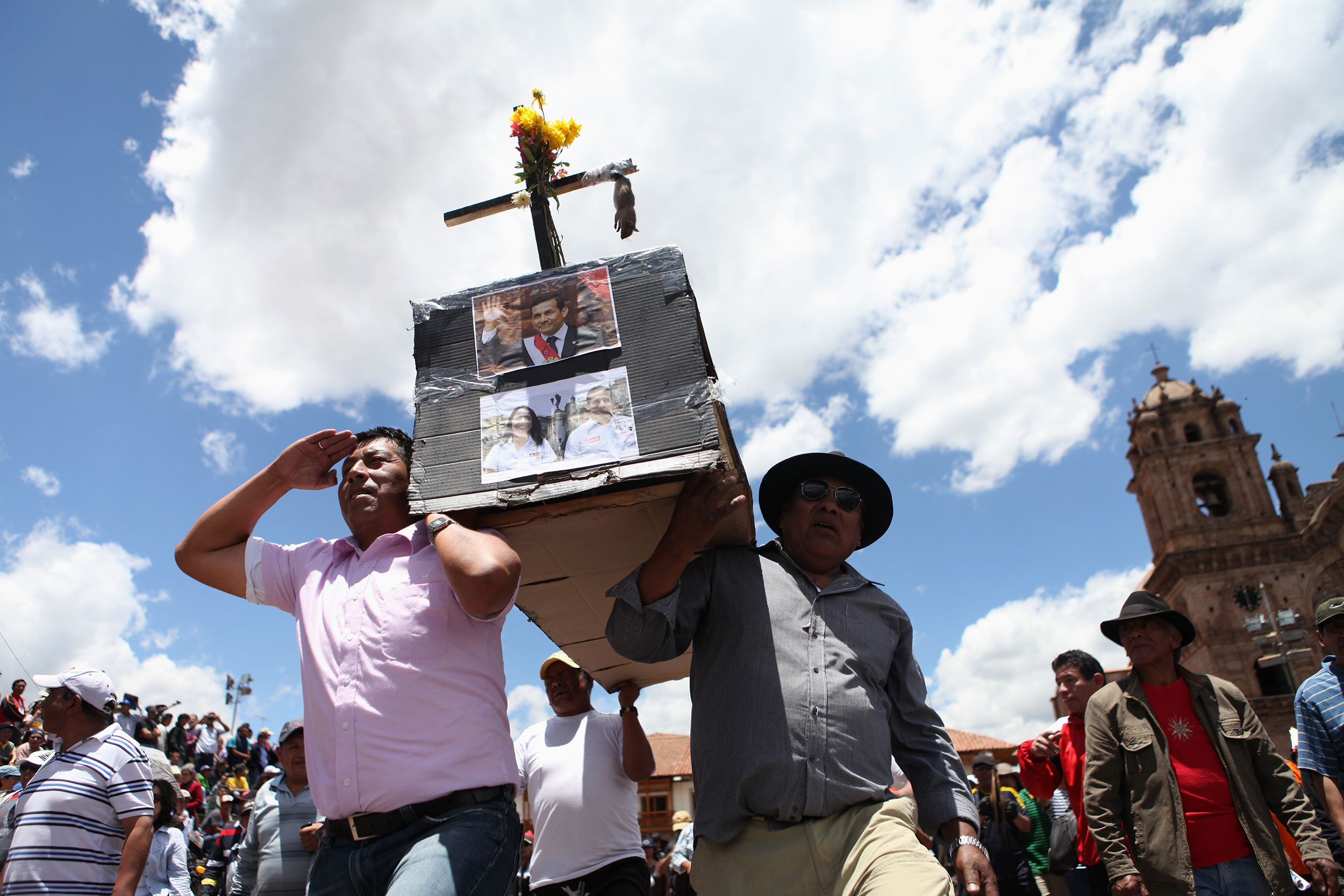 Protestors carry a faux coffin adorned with Peruvian President Ollanta Humala’s name, photos and a dead rat in the Plaza De Armas of Cusco, Peru before setting it on fire on Tuesday, Feb. 25, 2014. Thousands of gathered from various regions of Peru to protest corruption within the Peruvian government and prevented traffic from flowing through the city. Photo: Alex Washburn