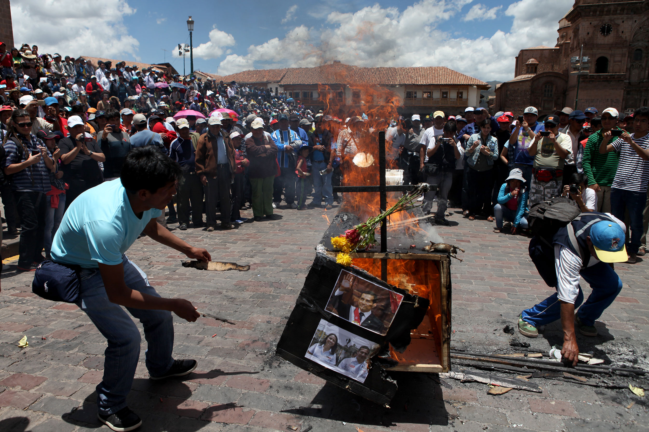 Protestors burn a coffin adorned with Peruvian President Ollanta Humala’s name and photos in the Plaza De Armas of Cusco on Tuesday, Feb. 25, 2014. People gathered from various regions of Peru to protest corruption within the Peruvian government and prevented traffic from flowing through the city and greater Cusco region. Photo: Alex Washburn