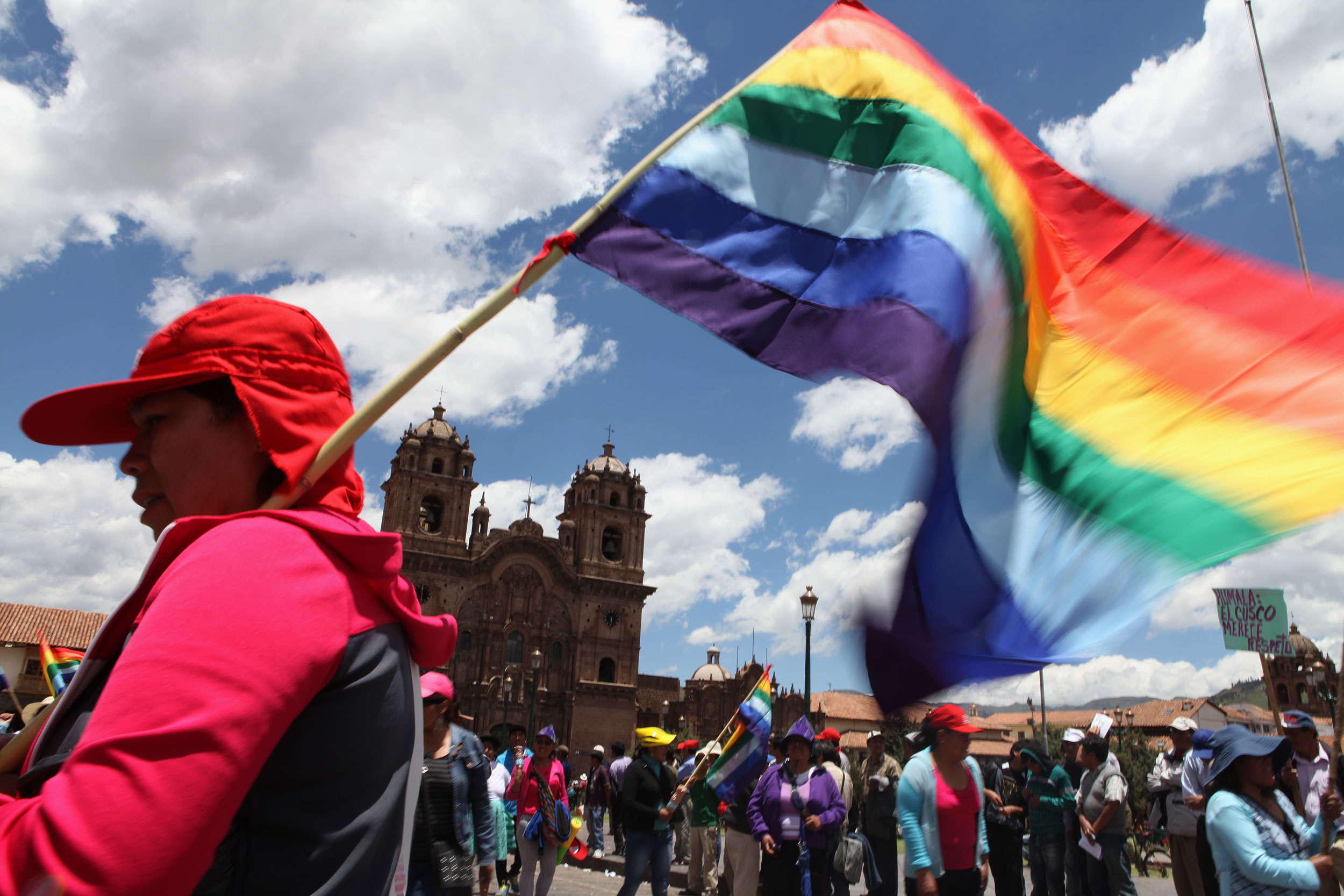A protestor carrying the city flag of Cusco participates in a demonstration in Plaza De Armas of Cusco, Peru on Tuesday, Feb. 25, 2014. Photo: Alex Washburn