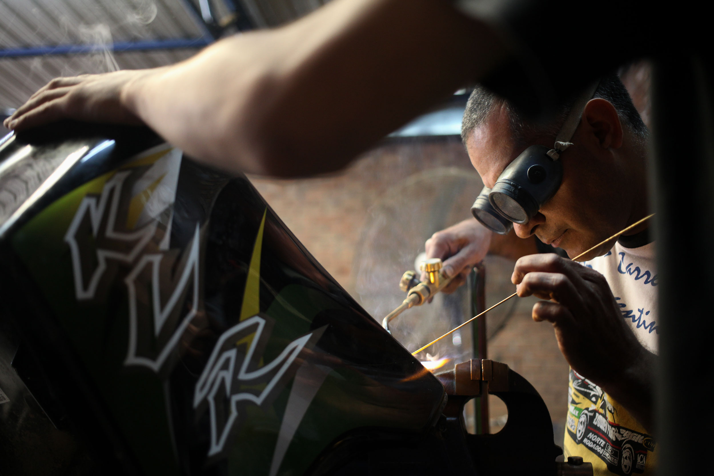 When we came back at four we rolled our bikes into the back portion of his house and Ariel’s assistant went to work draining Nathaniel’s gas tank after they had a look at the cracks and temporary repairs. Ariel floated around monitoring his assistant, drinking mate and helping another young guy in the shop who was working on his own bike. The whole process was very laid back, so after an hour and a half the tank was prepped for surgery and Ariel went to work with the blow torch.