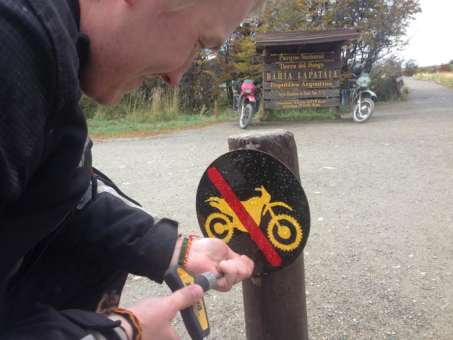 While we were snapping pictures and rejoicing at the official end of the autopista, another tourist strolling by told us we shouldn’t leave our bikes their as we might get a ticket. Not that we were planning on doing this, but it spurred in us a desire to take the no motorcycles sign that adorned the pillars in front of the Ruta-3 sign. We had been joking about taking a Ruta-40 sign, but they were too big, this was the perfect size and was held on by two flimsy looking screws. Out came the tool kit, and in less than a minute the sign was safely tucked away in our panniers, motorcycles once again free to bask in the glory of their accomplishment.