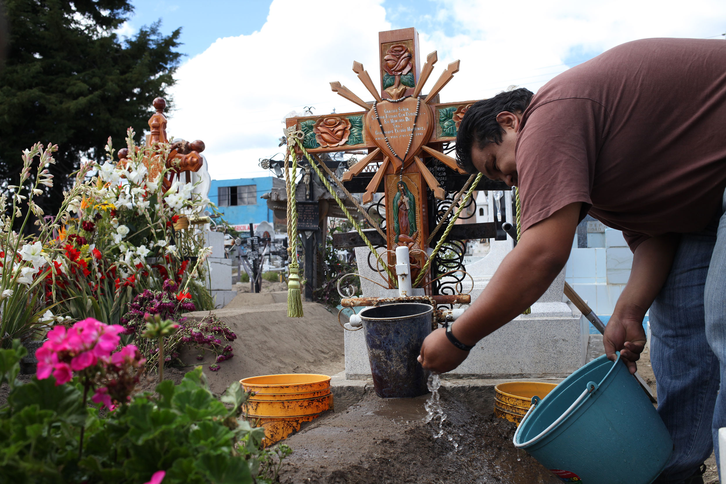 My cousin Cesar sprinkles water on our Abuelita’s grave in preparation for Dia De Los Muertos. Photo: Alex Washburn