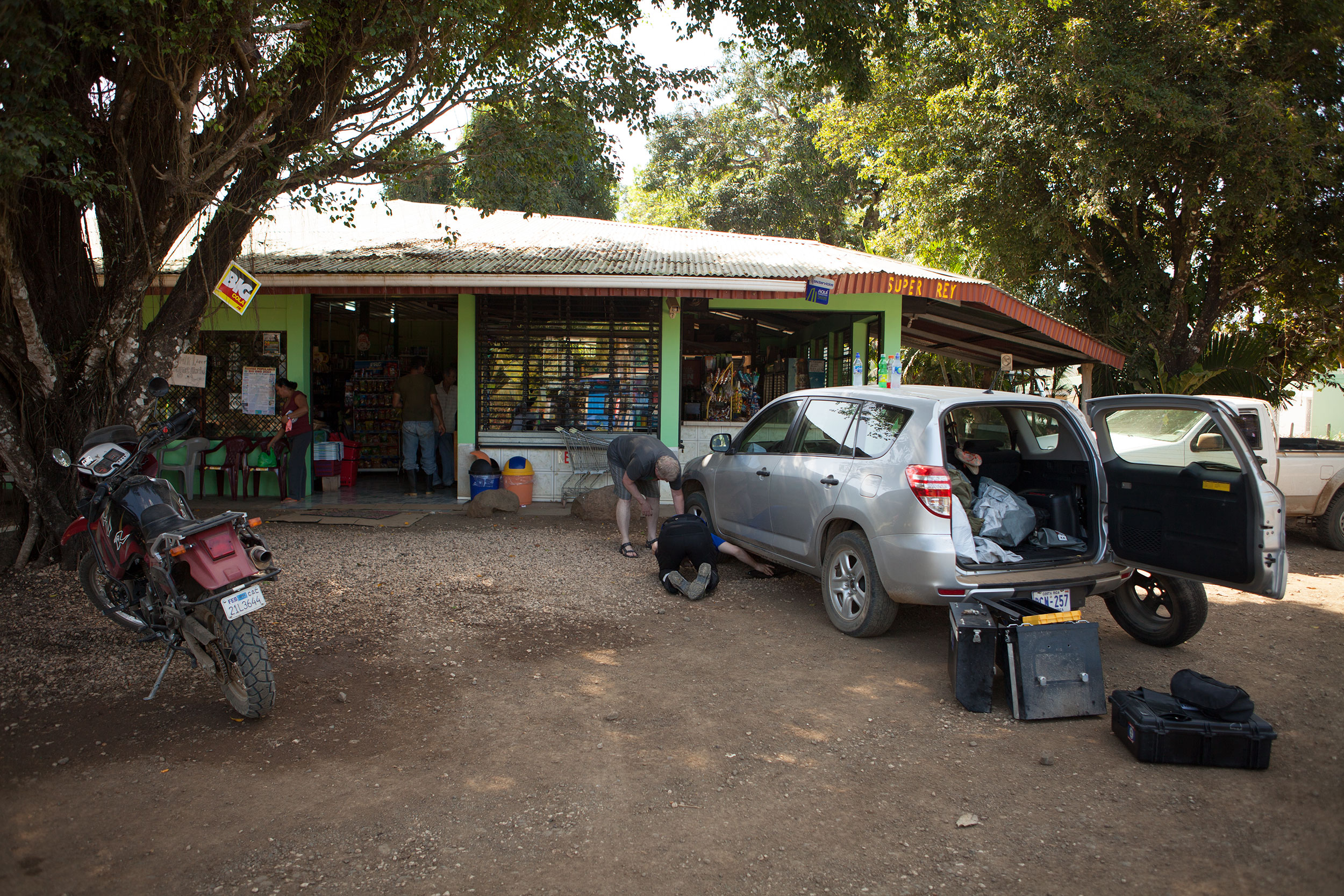 There could be a reason that the GPS told us to go around the peninsula and take a ferry to Montezuma instead of driving there from Tamarindo. On a path that is not serviceable in the rainy season, Dave in his Rav4 and we on the bikes, set out on our way to Montezuma (maybe this was a little revenge for us), along the only main highway that connects the peninsula with he mainland. Once we got to the junction of 18 and 21, we shut the GPS off and traveled on into the green wilderness. (Here Dave and Nathaniel are fixing Dave’s flat tire) Photo: Alex Washburn